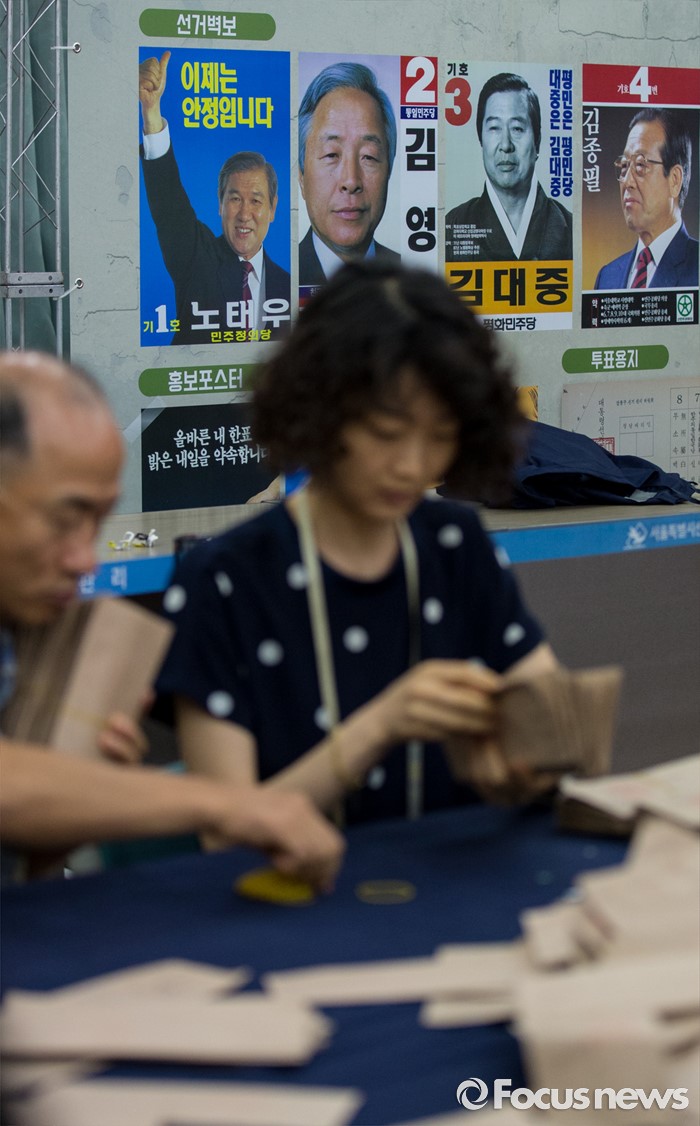 (서울=포커스뉴스) 20일 오전 서울 종로구 선거연수원에서 개표사무원들이 1987년 제13대 대통령선거 구로구을 우편투표함에서 꺼낸 투표용지를 계수하고 있다.