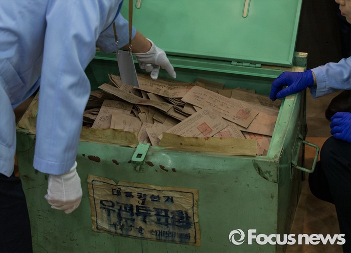 (서울=포커스뉴스) 20일 오전 서울 종로구 선거연수원에서 관계자들이 1987년 제13대 대통령선거 구로구을 우편투표함을 개봉하고 있다.
