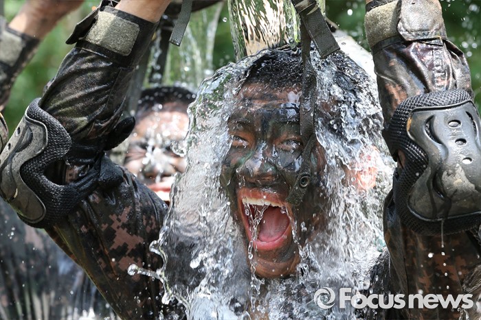 (논산=포커스뉴스) 폭염경보가 발령된 21일 충남 논산 연무읍 육군훈련소 각계전투종합훈련장에서 26교육연대 3교육대 훈련병들이 훈련을 받고 샤워를 하며 더위를 식히고 있다.