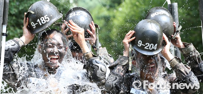 (논산=포커스뉴스) 폭염경보가 발령된 21일 충남 논산 연무읍 육군훈련소 각개전투종합훈련장에서 26교육연대 3교육대 훈련병들이 훈련을 받고 샤워를 하며 더위를 식히고 있다.