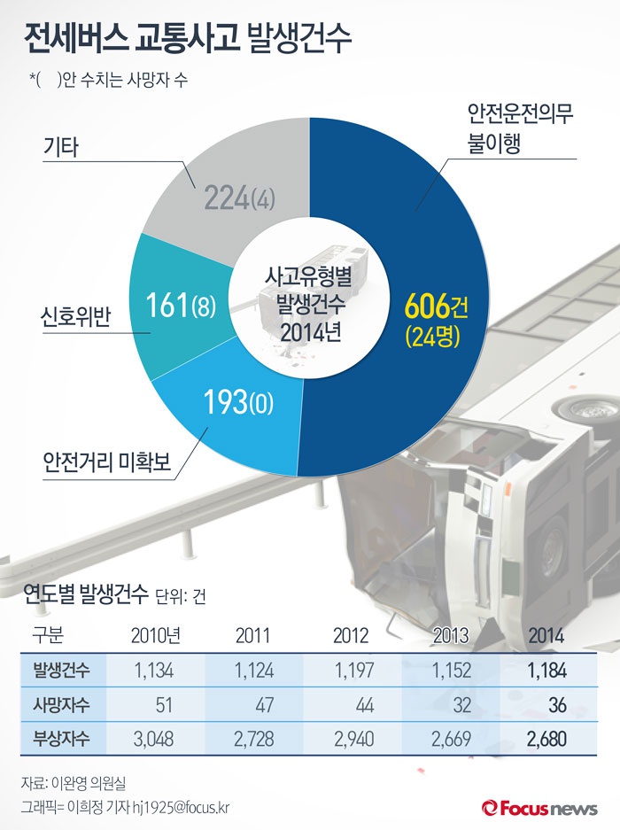 (서울=포커스뉴스) 지난해 이완영 의원이 발표한 자료에 따르면 최근 5년 동안 전세버스 교통사고가 연간 1100~1200건 발생한 것으로 조사됐다. 이 중 2014년 졸음운전 등 '안전운전의무 불이행'으로 인해 발생한 사고는 전체의 51.2%(606건)에 달했다.