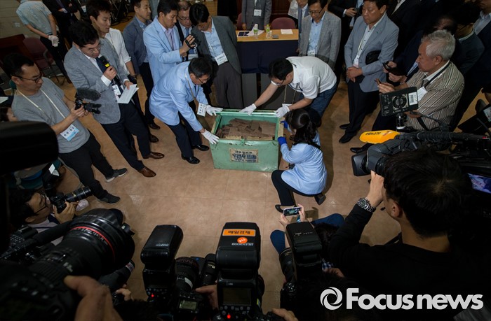 (서울=포커스뉴스) 1987년 대선 당시 부정투표 의혹에 휩싸였던 서울 구로구을 부재자 우편투표함이 21일 오전 종로 선거연수원에서 개봉됐다. 29년 만의 일이다.