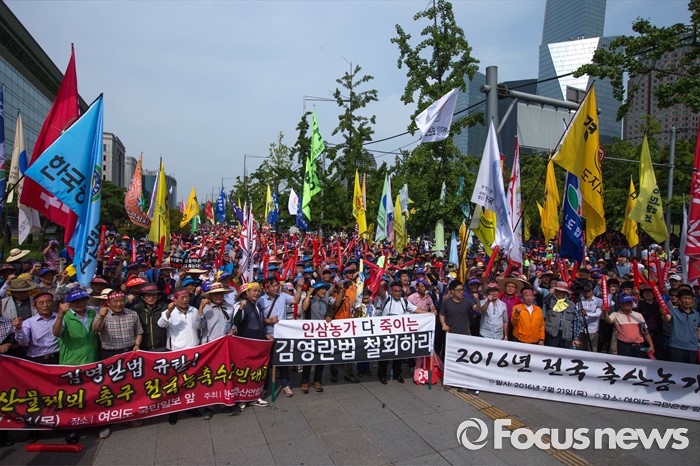 (서울=포커스뉴스) 21일 오후 서울 여의도 산업은행 본점 앞에서 농축산물의 김영란법 적용 제외를 요구하는 전국 농축산인 총궐기대회가 열리고 있다.