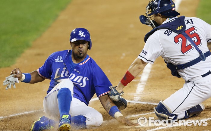 (서울=포커스뉴스) 21일 서울 잠실구장에서 열린 2016 프로야구 삼성-두산 경기 6회초 1사 만루에서 삼성 김상수의 중견수 희생플라이때 3루주자 발디리스가 홈으로 뛰어들어 세이프되고 있다.