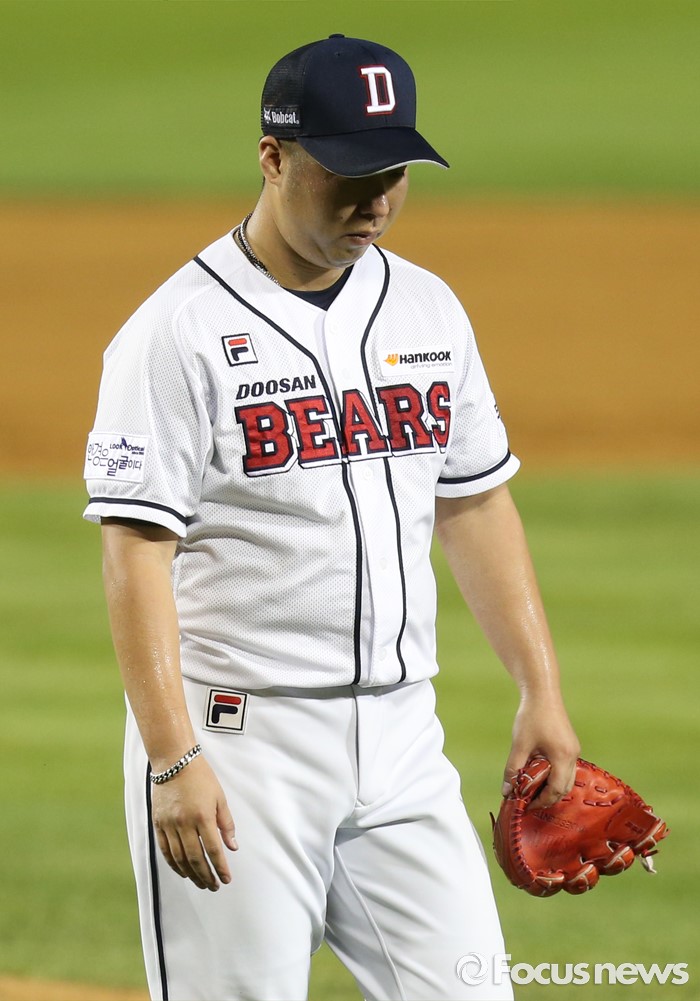 (서울=포커스뉴스) 21일 서울 잠실구장에서 열린 2016 프로야구 삼성-두산 경기에서 두산 투수 유희관이 6회초에 3실점하고 마운드를 내려가고 있다.