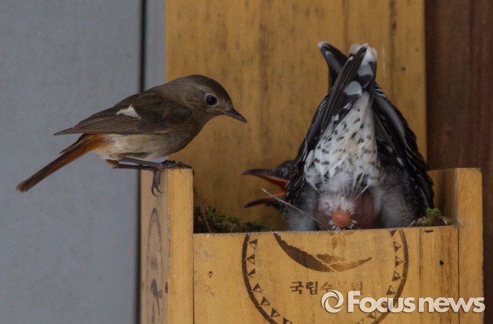 (포천=포커스뉴스) 딱새 암컷이 21일 국립수목원 광릉숲에서 자신이 기른 뻐꾸기 새끼가 응아 하기를 기다리고 있다.