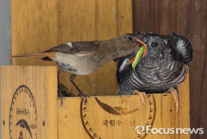 (포천= 포커스뉴스) 딱새 암컷(왼쪽)이 21일 경기 포천시 소홀읍 국립수목원 광릉숲 관리동 우편함에서자신의 자식을 죽인 뻐꾸기 새끼를 자신의 자식으로 착각, 잡아 온 먹이를 먹이고 있다.