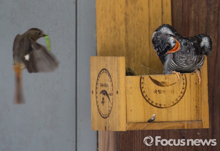 (포천=포커스뉴스)국립수목원 광릉숲관리동 우체통에서 뻐꾸기 유조가 대리모인 딱새 암컷이 물어오는 먹이를 기다리고 있다. 뻐꾸기는둥지가 없이 다른 새의 둥지에 몰래 알을 낳아 놓는다. 뻐꾸기 알은 원 둥지의 알보다 먼저 부화해 다른 알들을 모두 둥지 밖으로 밀쳐버린다. 딱새, 뱁새,개개비 같은둥지의 원 주인은 뻐꾸기 새끼가 자기 자식인 줄 알고둥지를 이소 할 때까지열심히 기른다. 사진속의 딱새도 사실은 자기 자식을 죽인 배은망덕한 놈 인데, 자신보다 덩치가 2.5배나 큰 녀석을 혼신을 다해 양육하고 있다.