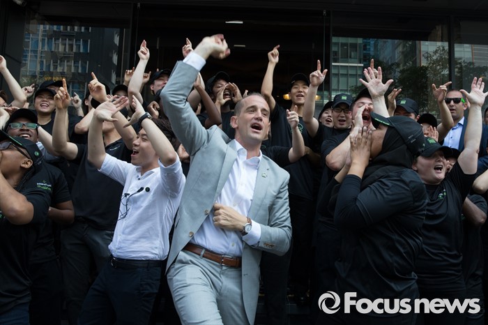 (서울=포커스뉴스) 22일 오전 서울 강남구 쉐이크쉑 국내 1호점 매장 오픈 행사에서 랜디 가루티 쉐이크쉑 CEO와 직원들이 춤을 추고 있다.