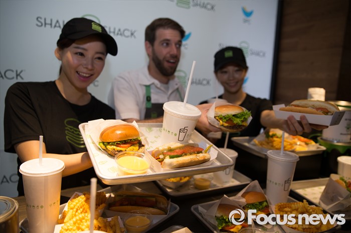 (서울=포커스뉴스) 22일 오전 서울 강남구 쉐이크쉑 국내 1호점 매장에서 쉐이크쉑 푸드 디렉터 마크 로사티(가운데)와 모델들이 제품을 선보이고 있다. 기본 버거인 쉑버거 단품이 6900원, 슈룸버거 단품 9400원, 감자튀김 3900원, 쉐이크 음료가 5900원이다.