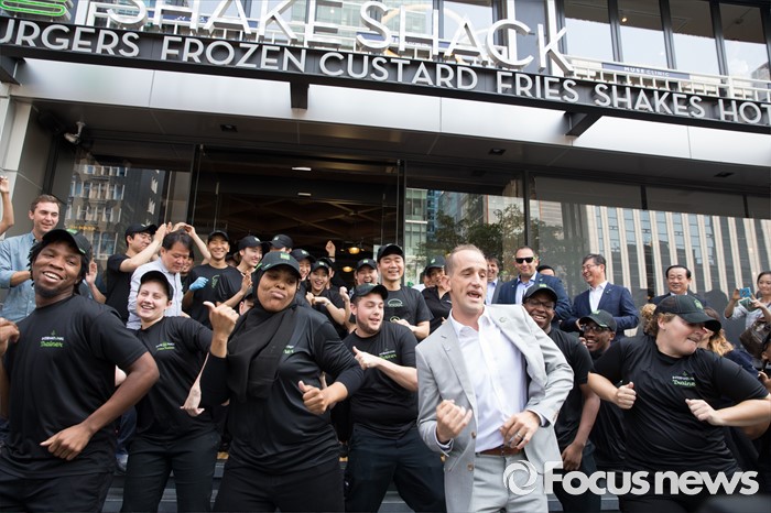 (서울=포커스뉴스) 22일 오전 서울 강남구 쉐이크쉑 국내 1호점 매장 오픈 행사에서 랜디 가루티 쉐이크쉑 CEO와 직원들이 춤을 추고 있다.