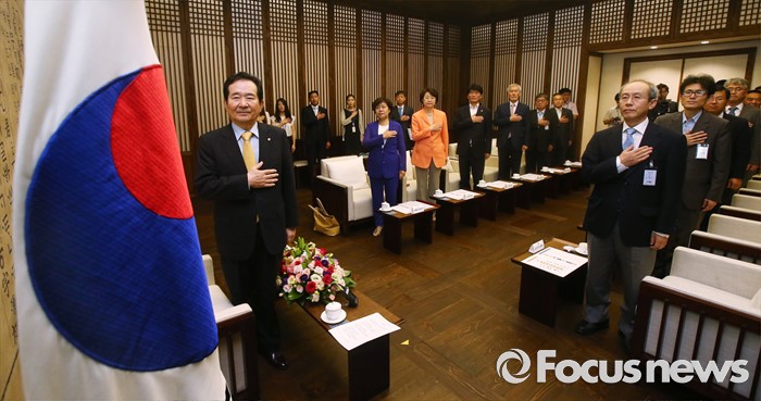(서울=포커스뉴스) 22일 오전 서울 여의도 국회 의장접견실에서 열린 국회 공직자윤리위원회 위촉식에 참석한 정세균 국회의장과 위원들이 국기에 대한 경례를 하고 있다.