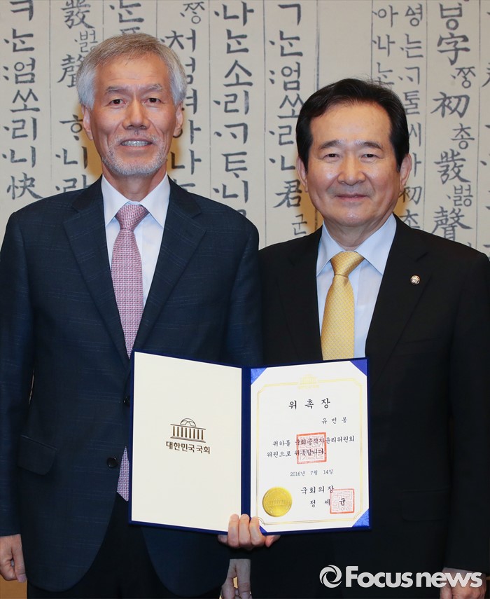 (서울=포커스뉴스) 22일 오전 서울 여의도 국회 의장접견실에서 열린 국회 공직자윤리위원회 위촉식에 참석한 정세균(오른쪽) 국회의장이 유민봉 위원에게 위촉장을 수여한 뒤 포즈를 취하고 있다.