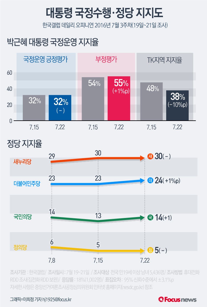 (서울=포커스뉴스) 22일 발표한 한국갤럽 데일리 오피니언 7월 3주차에 따르면 박근혜 대통령의 주요지지기반인 TK(대구· 경북)에서의 박대통령 지지율이 전주대비 10%p 하락한것으로 나타났다. 정당지지율은 지난주와 비슷한 양상을 보였다.