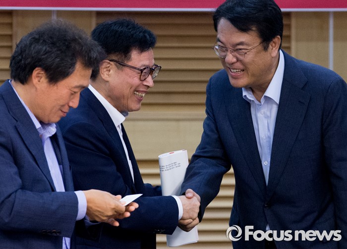 (서울=포커스뉴스) 22일 오후 서울 여의도 국회 의원회관에서 열린 '격차해소를 위한 해법, 왜 중향평준화인가?' 세미나에 참석한 정진석 새누리당 원내대표가 참석자들과 인사하고 있다.