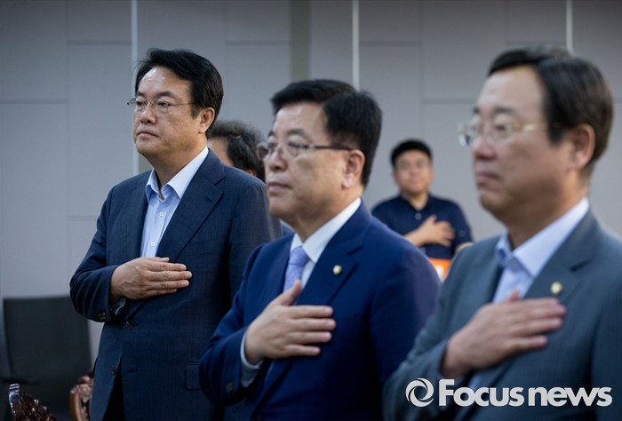 | △ 국민의례하는 정진석-김광림-김종석 |