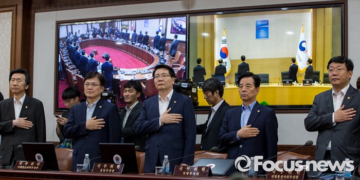 (서울=포커스뉴스) 22일 오후 서울정부청사에서 열린 임시 국무회의에 참석한 국무위원들이 국민의례를 하고 있다. 정부는 이날 국무회의에서 추경의 세부안을 확정해 26일 국회에 제출할 계획이다.
