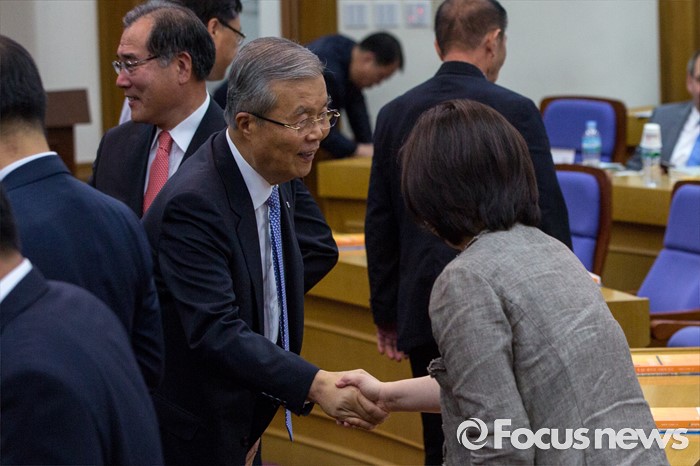 (서울=포커스뉴스) 김종인(오른쪽 두 번째) 더불어민주당 비상대책위 대표와 심상정(오른쪽) 정의당 상임대표가 22일 오후 서울 여의도 국회의원회관에서 열린 '5.18 왜곡 방지와 관련 법안 개정(처별규정) 위한 국민 토론회'에 참석해 악수 하고 있다.
