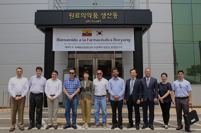 한편, 지난 2014년 우리나라와 에콰도르는 의약품 인허가 간소화 제도인 자동승인제도를 체결하며 우리나라 의약품이 까다로운 인허가 절차 없이 에콰도르에 진출할 수 있게 됐다22일 보령제약 안산공장에서 보령제약 김은선회장(왼쪽에서 다섯번째), 에콰도르 후안 까를로스 까씨넬리 국제통상장관(왼쪽에서 네번째), 오스카 에레라 주한 에콰도르 대사(왼쪽에서 여섯번째), 마르셀로 파소스 주한 에콰도르 상무관(오른쪽에서 첫번째) 등 보령제약 임원들과 에콰도르 측 관계자들이 방문기념 촬영을 하고 있다. <사진출처=보령제약>