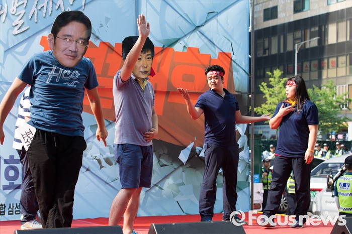 (서울=포커스뉴스) 금속노조 삼성전자서비스지회 조합원들이 22일 오후 서울 서초구 삼성 서초사옥 앞에서 열린 '재벌개혁 투쟁 결의대회'에 참석해 이재용 3대 세습을 비판하는 퍼포먼스를 펼치고 있다.