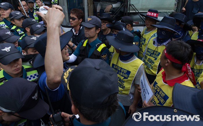 (서울=포커스뉴스) 금속노조 삼성전자서비스지회 조합원들이 22일 오후 서울 서초구 삼성 서초사옥 앞에서 열린 '재벌개혁 투쟁 결의대회'에 참석해 수리기사 추락사에 따른 안전대책 마련을 위한 대원청 요구안을 전달하기 위해 이동하던 중 경찰과 충돌하고 있다.