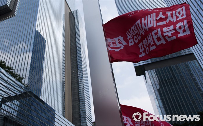 (서울=포커스뉴스) 22일 오후 서울 서초구 삼성 서초사옥 앞에서 열린 '재벌개혁 투쟁 결의대회'에서 삼성전자서비스지회 노조 깃발이 바람에 휘날리고 있다.
