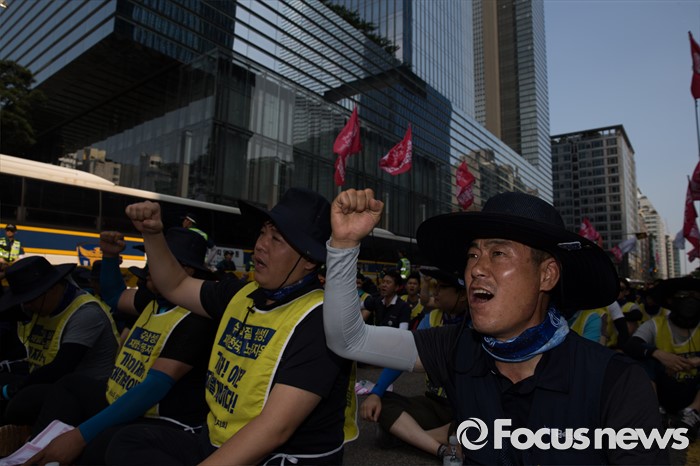 (서울=포커스뉴스) 금속노조 삼성전자서비스지회 조합원들이 22일 오후 서울 서초구 삼성 서초사옥 앞에서 열린 '재벌개혁 투쟁 결의대회'에 참석해 삼성가 3대 세습을 비판하는 구호를 외치고 있다.