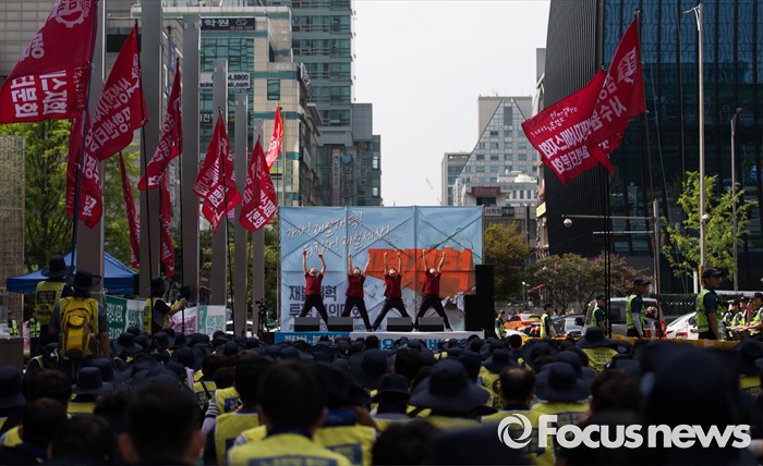 (서울=포커스뉴스) 금속노조 삼성전자서비스지회 조합원들이 22일 오후 서울 서초구 삼성 서초사옥 앞에서 열린 '재벌개혁 투쟁 결의대회'에 참석해 율동을 선보이고 있다.