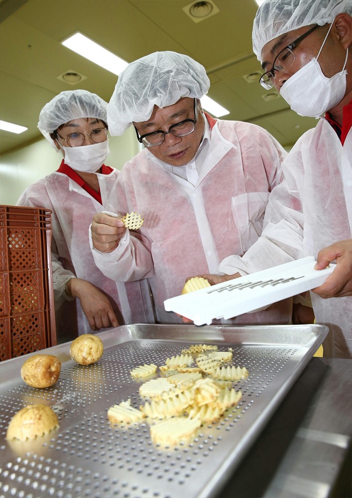 (옥천=포커스뉴스) 이동필 농림축산식품부 장관이 22일 충북 옥천군 옥천읍의 농식품 상생협력 우수업체인 '농업회사법인 회오리감자(유)'를 찾아 감자를 이용한 다양한 제품 생산과정을 둘러보고 있다. <사진제공=농림축산식품부>
