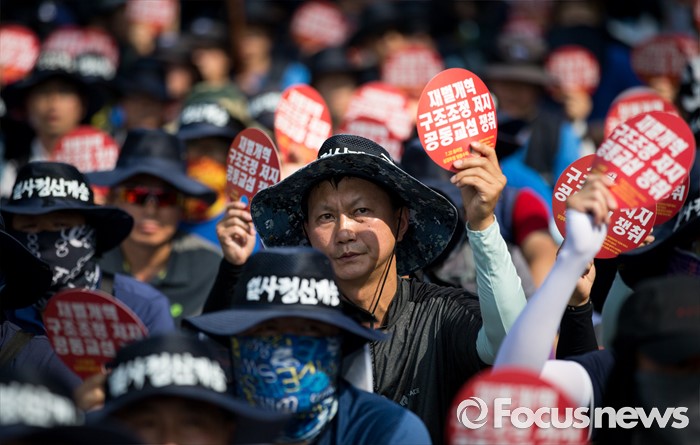 (서울=포커스뉴스) 정부의 일방적인 조선업 구조조정 중단과 현대차 그룹의 성실한 그룹사 공동교섭 참여, 정부의 노동개악 철회등을 내걸며 파업에 들어간 전국금속노조가 22일 오후 서울 서초구 현대자동차 본사 앞에서 금속노조 총파업 대회를 열고 있다.