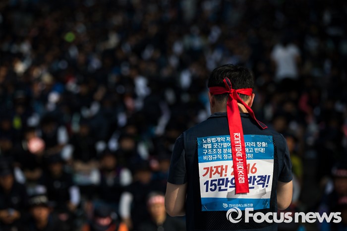 (서울=포커스뉴스) 정부의 일방적인 조선업 구조조정 중단과 현대차 그룹의 성실한 그룹사 공동교섭 참여, 정부의 노동개악 철회등을 내걸며 파업에 들어간 전국금속노조가 22일 오후 서울 서초구 현대자동차 본사 앞에서 금속노조 총파업 대회를 열고 있다.