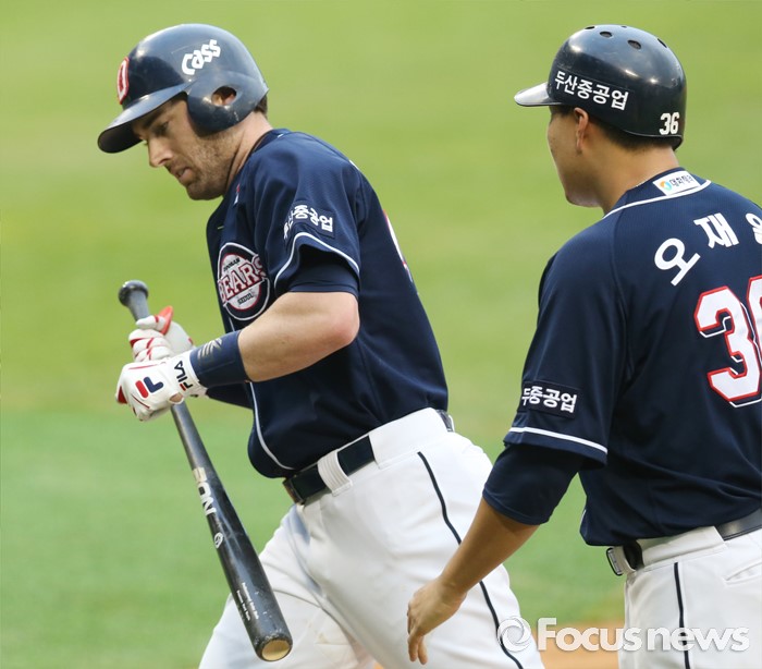 (서울=포커스뉴스) 22일 서울 잠실구장에서 열린 2016 프로야구 두산-LG 경기 2회초 1사 1루에서 두산 에반스가 좌월 2점 홈런을 치고 선행주자 오재일의 환영을 받으며 홈인하고 있다.