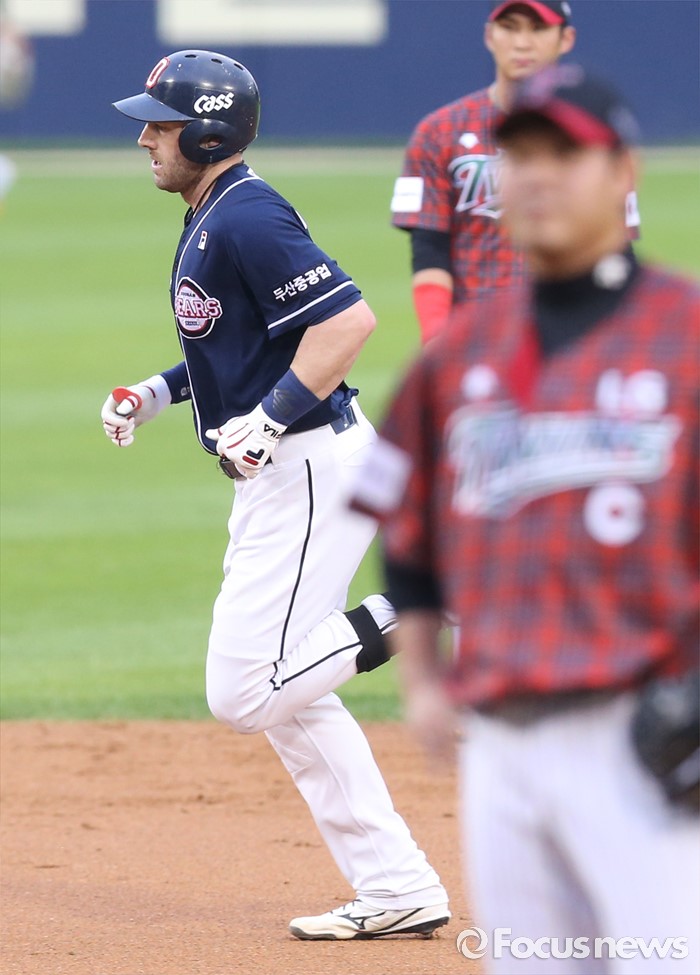 (서울=포커스뉴스) 22일 서울 잠실구장에서 열린 2016 프로야구 두산-LG 경기 2회초 1사 1루에서 두산 에반스가 좌월 2점 홈런을 치고 베이스를 돌고 있다.