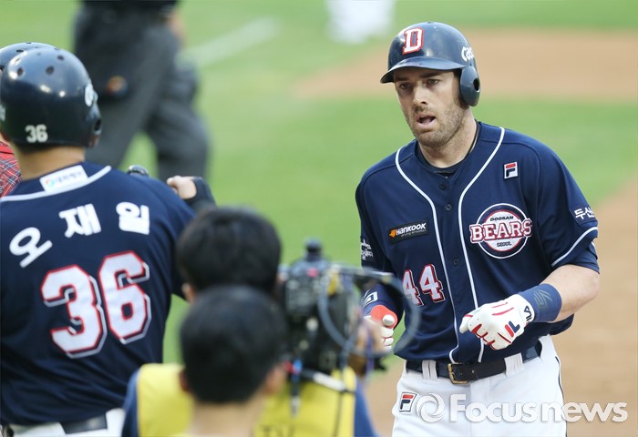 (서울=포커스뉴스) 22일 서울 잠실구장에서 열린 2016 프로야구 두산-LG 경기 2회초 1사 1루에서 두산 에반스가 좌월 2점 홈런을 치고 선행주자 오재일의 환영을 받으며 홈인하고 있다.