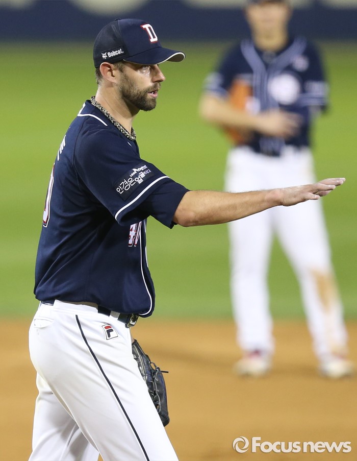 (서울=포커스뉴스) 22일 서울 잠실구장에서 열린 2016 프로야구 두산-LG 경기 6회 1사 1,3루에서 두산 투수 니퍼트가 LG 채은성을 몸에 맞는 볼로 진루시키고 사과의 표시를 하고 있다.