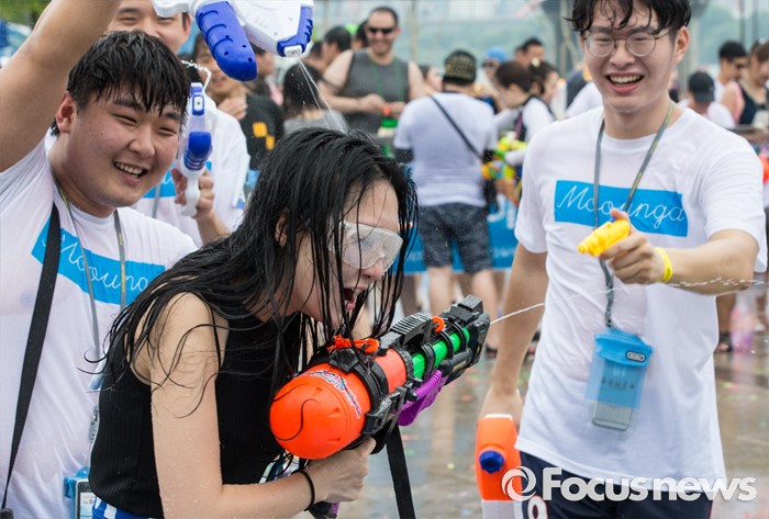 (서울=포커스뉴스) 23일 오후 서울 여의도 한강공원에서 열린 한강 물싸움 축제에서 참가자들이 시원한 물총싸움을 하며 더위를 식히고 있다.