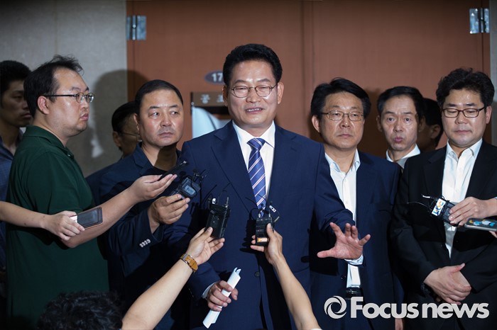 (서울=포커스뉴스) 송영길 더불어민주당 의원이 24일 오전 서울 여의도 국회 정론관에서 당대표 출마 기자회견을 마친 뒤 취재진 질문에 답하고 있다.