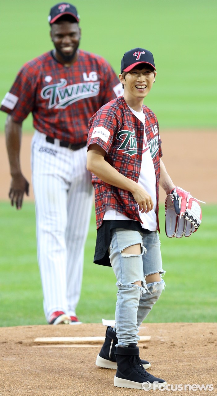 (서울=포커스뉴스) 24일 서울 잠실구장에서 열린 2016 프로야구 두산-LG 경기에 앞서 가수 장우혁이 시구하며 볼을 그라운드에 패대기치고 황당한 웃음을 짓고 있다. LG 선발투수 소사도 웃고 있다.