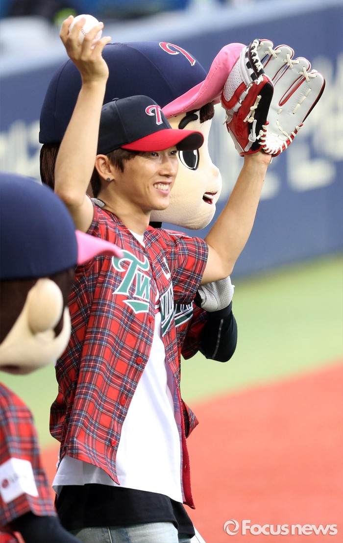 (서울=포커스뉴스) 24일 서울 잠실구장에서 열린 2016 프로야구 두산-LG 경기에 앞서 시구자롤 나온 가수 장우혁이 두 손을 흔들며 팬에게 인사하고 있다.