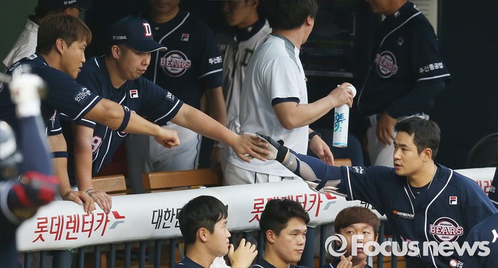 (서울=포커스뉴스) 24일 서울 잠실구장에서 열린 2016 프로야구 두산-LG 경기 2회초 두산 선두타자 김재환이 중월 솔로 홈런을 치고 더그아웃에서 유희관, 홍성흔의 축하를 받고 있다.
