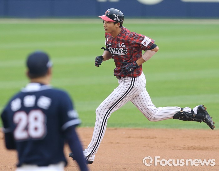 (서울=포커스뉴스) 24일 서울 잠실구장에서 열린 2016 프로야구 두산-LG 경기 1회말 LG 김용의가 1번타자로 나온 첫 경기 첫 타석에서 좌월 선제 솔로 홈런을 치고 베이스를 돌고 있다.