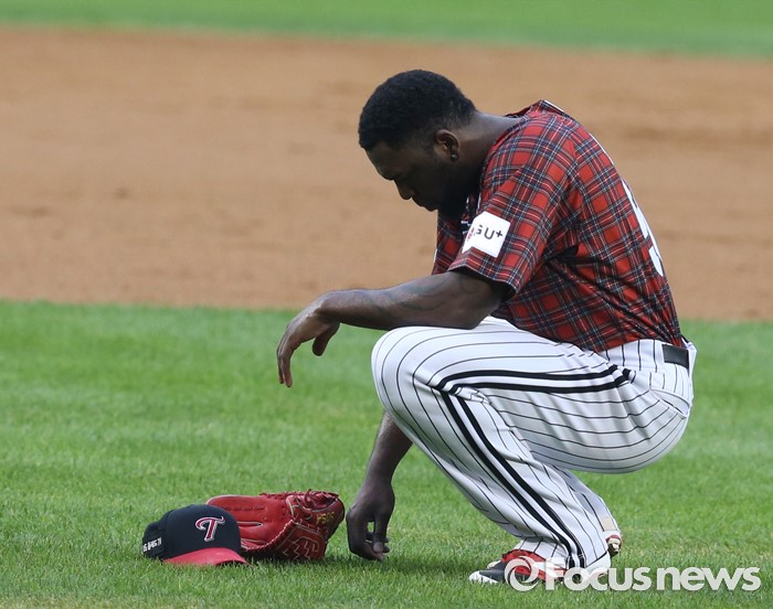 | △ 잔디 고르는 LG 투수 소사 |
