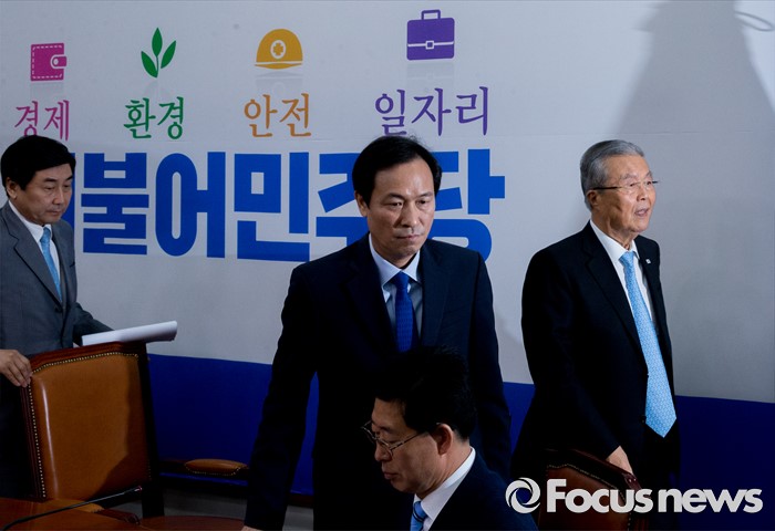 (서울=포커스뉴스) 김종인(오른쪽) 더불어민주당 비대위 대표와 우상호(가운데) 원내대표 등이 25일 오전 서울 여의도 국회에서 비상대책위원회의를 마친 뒤 퇴장하고 있다.