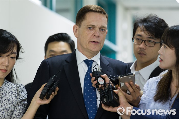 (인천=포커스뉴스) 요하네스 타머 아우디폭스바겐 사장이 25일 오전 인천 서구 국립환경과학원에서 열린 차량 인증 조작 관련 환경부 청문회에 참석하며 취재진 질문에 답변하고 있다.