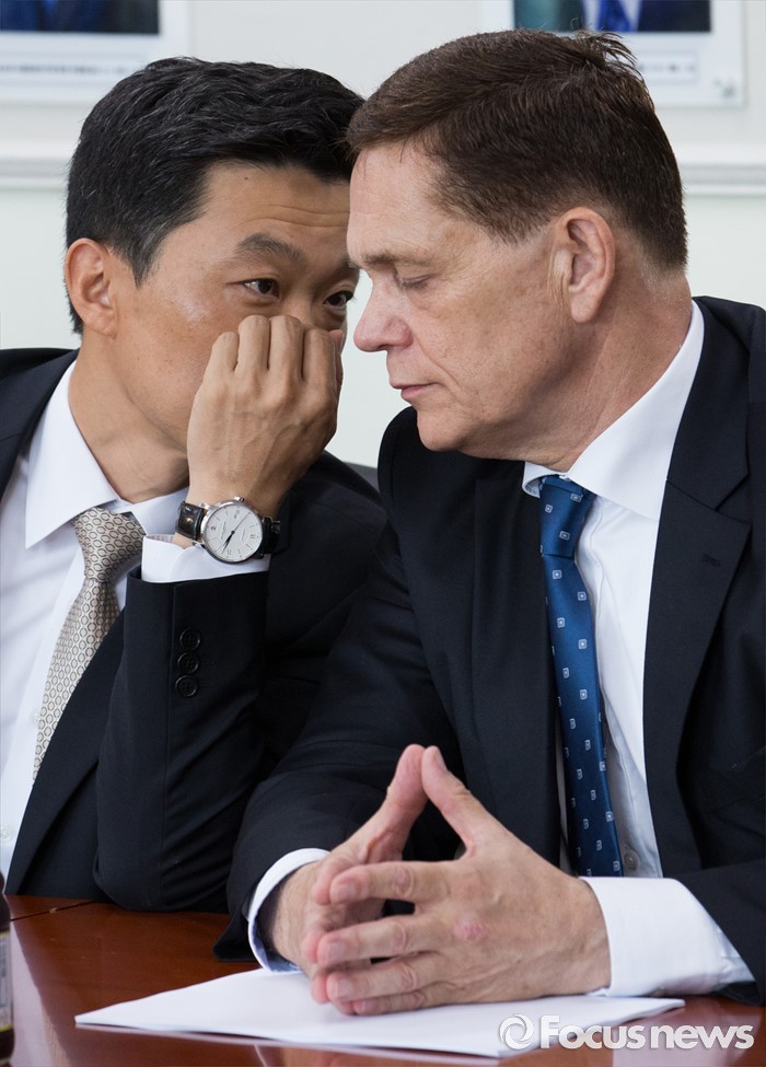 (인천=포커스뉴스) 요하네스 타머(오른쪽) 아우디폭스바겐 사장과 정재균 부사장이 25일 오전 인천 서구 국립환경과학원에서 열린 차량 인증 조작 관련 환경부 청문회에 참석해 대화 나누고 있다.