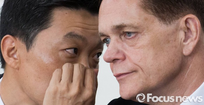 환경부는 이르면 이달말 인증취소·판매금지 조치를 확정할 계획이며, 아우디폭스바겐 코리아는 지난 22일 34개 차종, 79개 모델에 대해 25일부터 자발적으로 판매중단 할 것을 결정한 바 있다.(인천=포커스뉴스) 요하네스 타머(오른쪽) 아우디폭스바겐 사장과 정재균 부사장이 25일 오전 인천 서구 국립환경과학원에서 열린 차량 인증 조작 관련 환경부 청문회에 참석해 대화 나누고 있다.