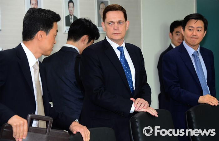 (인천=포커스뉴스) 요하네스 타머(가운데) 아우디폭스바겐 사장과 정재균(왼쪽) 부사장이 25일 오전 인천 서구 국립환경과학원에서 열린 차량 인증 조작 관련 환경부 청문회에 참석하고 있다.