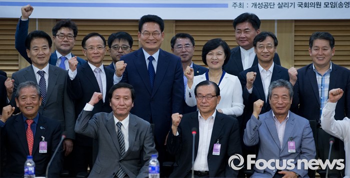 (서울=포커스뉴스) 25일 오전 서울 여의도 국회 의원회관에서 개성공단살리기 국회의원 모임 주최로 열린 개성공단 전면중단, 고도의 정치적 행위 논리 정당한가? 세미나에 전당대회 출마를 선언한 송영길, 추미애 더불어민주당 의원과 정기섭 개성공단기업 비대위원장 등 참석자들이 파이팅을 외치며 포즈를 취하고 있다.