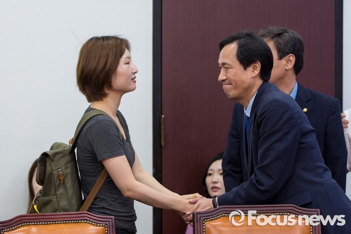 (서울=포커스뉴스) 우상호(오른쪽) 더불어민주당 원내대표와 백남기 농민의 딸 백도라지 씨가 25일 오전 서울 여의도 국회에서 열린 '백남기 농민 대책위원회 면담'에 참석해 악수 하고 있다.
