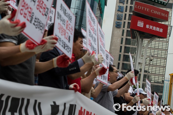 (서울=포커스뉴스) 25일 오전 서울 중구 롯데백화점 앞에서 롯데홈쇼핑 협력사 비상대책위원회원들이 생존권 보장을 촉구하며 집회를 열고 있다.